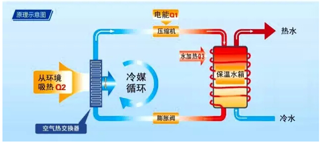 空氣能熱水器的工作原理與空調在冬季制熱相似。熱水器在電能的驅動下,以制冷劑為載體,以少量的電,從空氣中吸收熱量制取熱水,相比于普通熱水器單純的能量轉換,制熱效率更高,并實現(xiàn)了水電分離。安全性能更好。